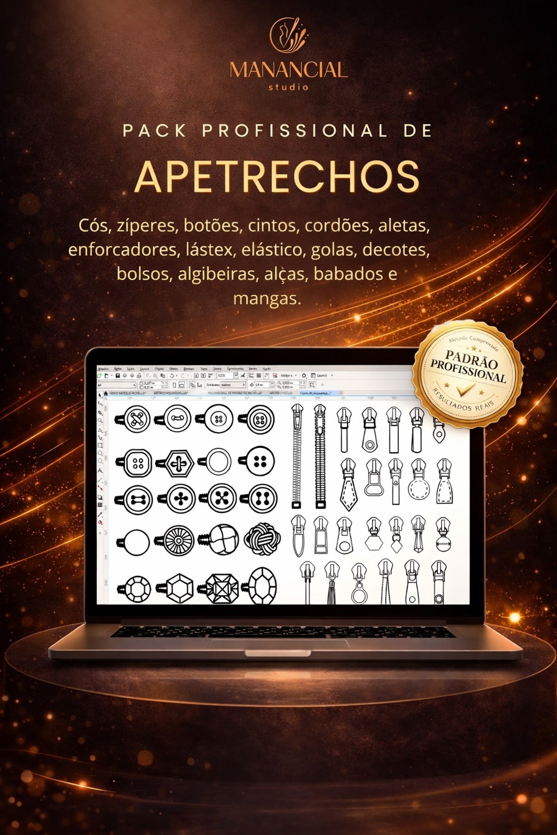 Com o pack de apetrechos, você tem acesso a elementos prontos como bolsos, golas, zíperes, botões, cintos, cós e muito mais — organizados para você aplicar diretamente nas suas peças.