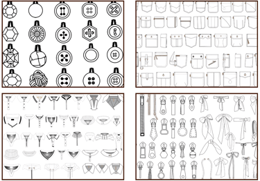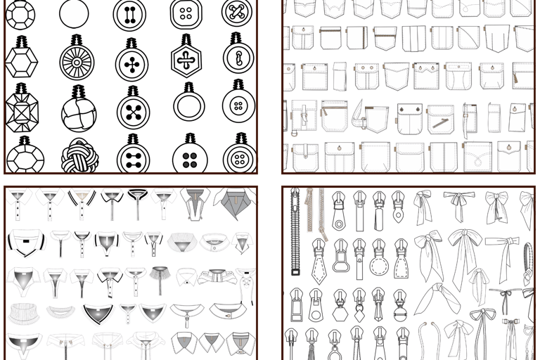 São elementos prontos como bolsos, golas, zíperes, botões, cós, cintos e outros detalhes que você pode aplicar diretamente nas suas peças.