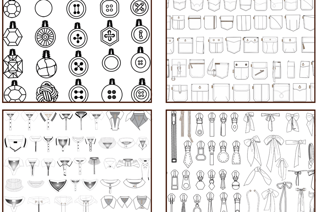 São elementos prontos como bolsos, golas, zíperes, botões, cós, cintos e outros detalhes que você pode aplicar diretamente nas suas peças.