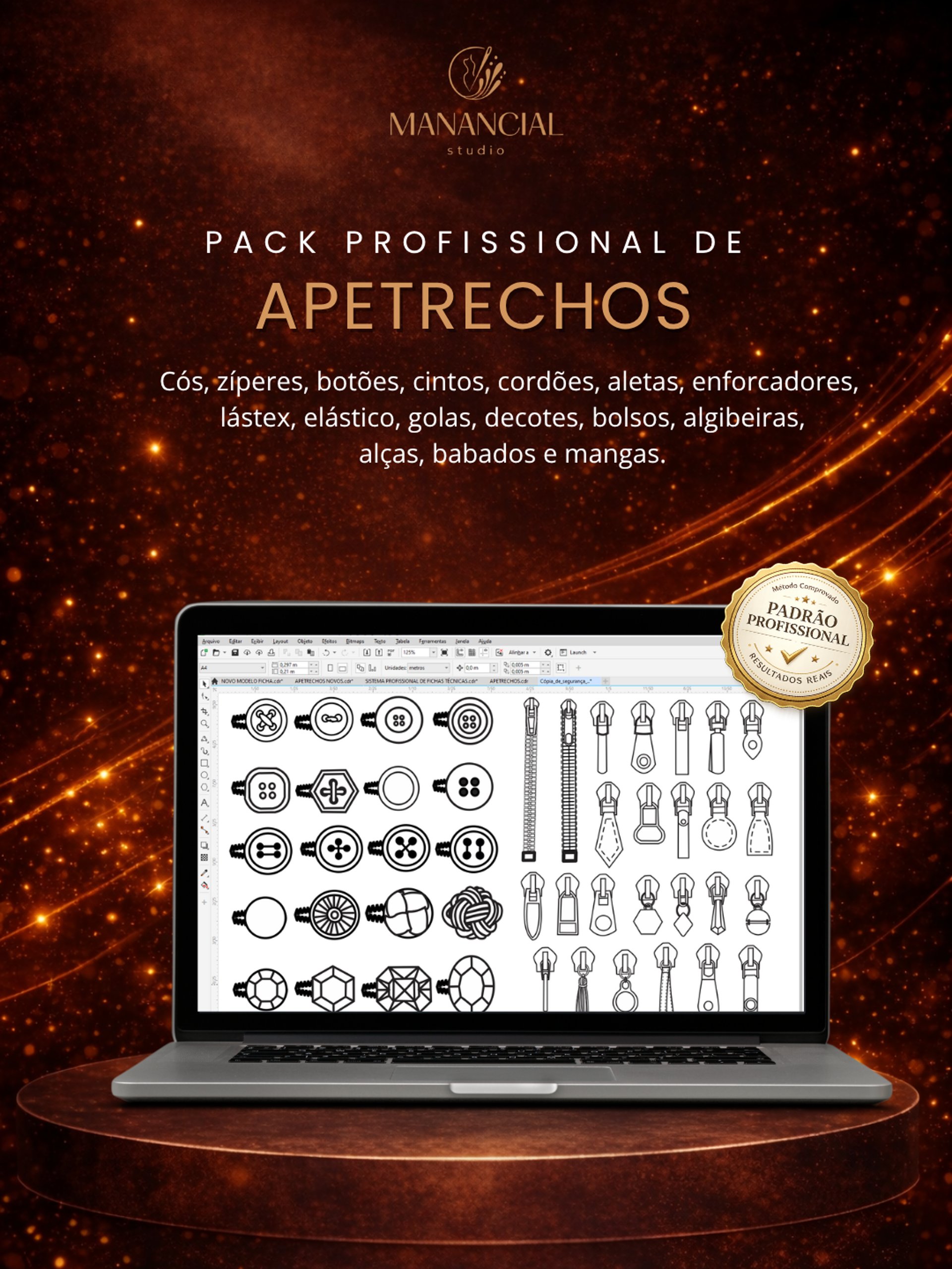 Com o pack de apetrechos, você tem acesso a elementos prontos como bolsos, golas, zíperes, botões, cintos, cós e muito mais — organizados para você aplicar diretamente nas suas peças.