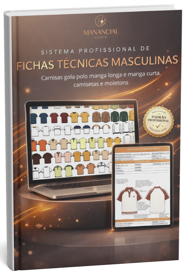 Tenha acesso a mais de 50 fichas técnicas masculinas prontas para produção, com modelos de camisetas, polos e moletons, totalmente editáveis e desenvolvidas com padrão profissional para acelerar suas criações.